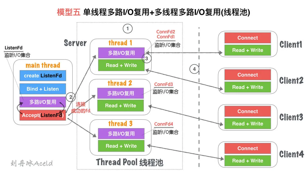 ① 主线程main thread创建listenFd之后,采用多路I/O复用机制(如:select、epoll)进行IO状态阻塞监控。有Client1客户端Connect请求,I/O复用机制检测到ListenFd触发读事件,则进行Accept建立连接,并将新生成的connFd1加入到监听I/O集合中。