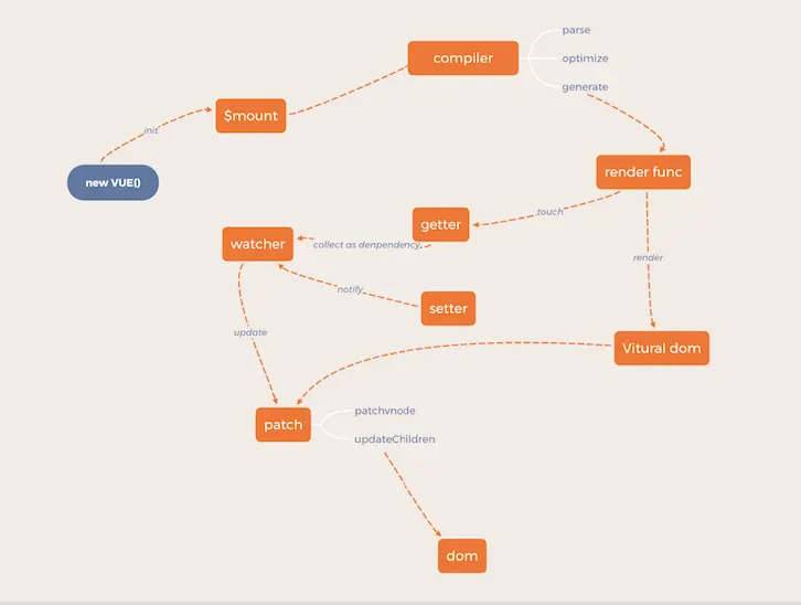 这种图从整体上描述了vuejs的运行机制,我们今天主要对其中的patch过程进行分析