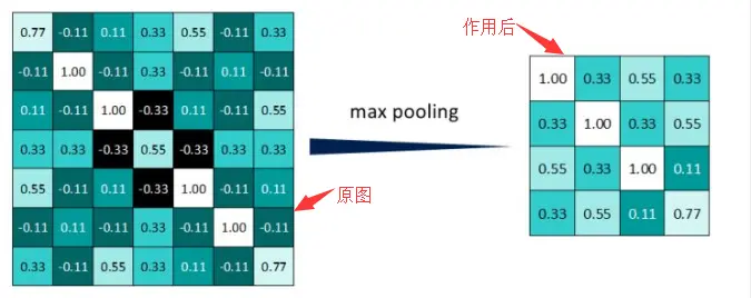 为什么要有池化层呢?那是因为进过卷积操作之后,得到了许多张有着不同值得特征图。而池化的目的就是减少数据量。池化分为最大池化(Max Pooling)、平均池化(Average Pooling),最大池化就是取最大值,平均池化就是取平均值。接下来我们拿最大池化举例:选择池化尺寸为2X2的窗口。