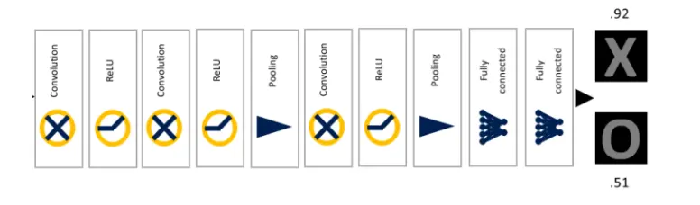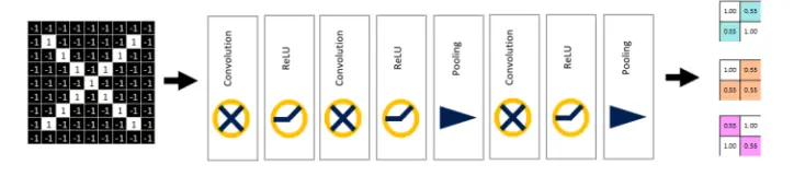原图片尺寸为9X9,经过一系列的卷积、Relu(非线性激活)、池化后,得到尺寸压缩为2X2的三张特征图。(为什么是三张呢?因为原图像为RGB图像,上述过程省略了一部分)
