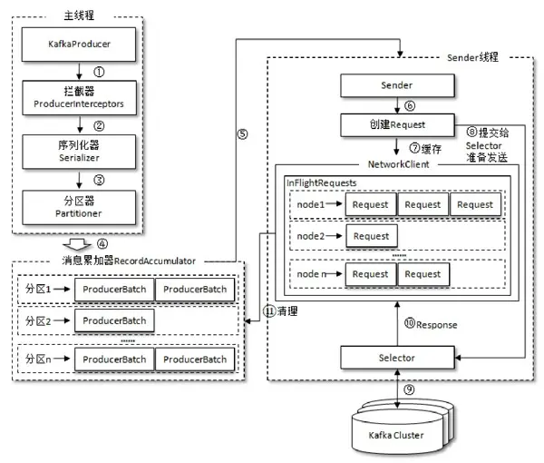 - 主线程:负责拦截、序列化、分区、消息累加,调用sender线程batch发送