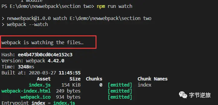 在package.json文件中添加一个“webpack --watch”配置(别名为watch),代替webpack,然后构建时运行 npm run watch,可以看到watch已经开始启动了。