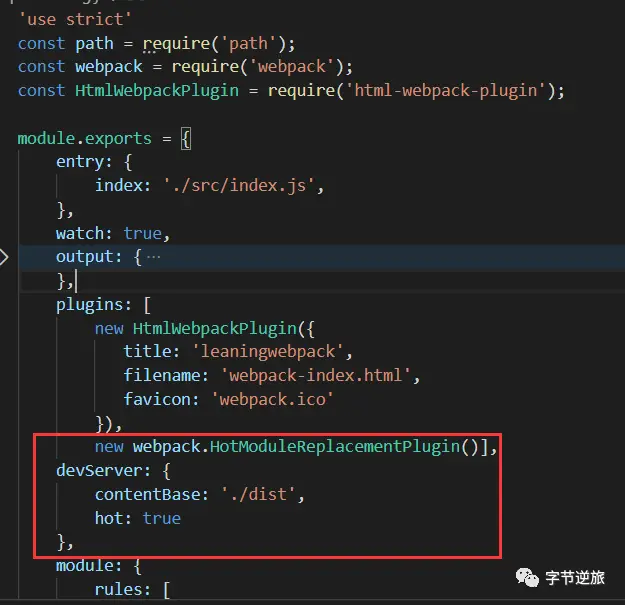 最后再添加一个与plugins同级的devServer配置,其中contentBase表示此热更新打包是针对dist文件里的内容,hot:true表示开启了热更新状态。