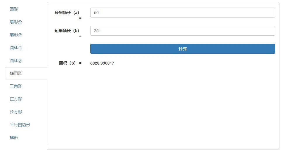 一个工具箱 之 面积计算器 Roc就是我76574 2020-04-06 769 阅读1分钟 面积计算器,支持常用几何图形面积的在线计算,包括圆形,扇形,椭圆形,圆环,三角形, 正方形,平行四边形,梯形等几何图形的面积在线计算。工具链接:www.atoolbox.net/Tool.php?Id…使用方法:选择几何图形,然后填写相应参数,点击“计算”即可。工具链接:www.atoolbox.net/Tool.php?Id…