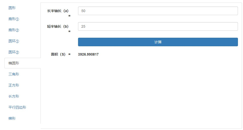 一个工具箱 之 面积计算器 Roc就是我76574 2020-04-06 797 阅读1分钟 面积计算器,支持常用几何图形面积的在线计算,包括圆形,扇形,椭圆形,圆环,三角形, 正方形,平行四边形,梯形等几何图形的面积在线计算。工具链接:www.atoolbox.net/Tool.php?Id…使用方法:选择几何图形,然后填写相应参数,点击“计算”即可。工具链接:www.atoolbox.net/Tool.php?Id…