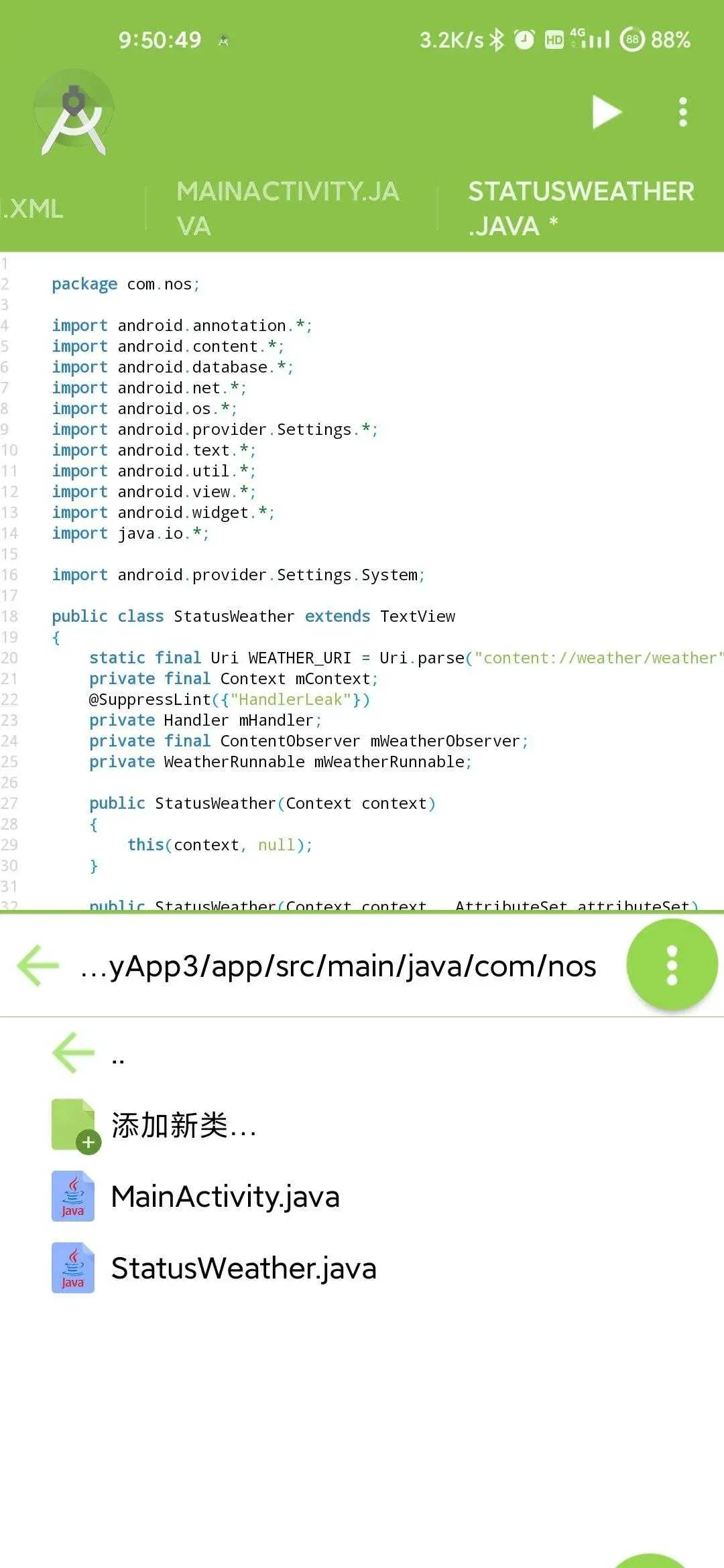 StatusWeather则是我们自定义的TextView,他用来获取本地的天气信息,内容观察者是为了其它的应用能够控制这个控件的显示与隐藏