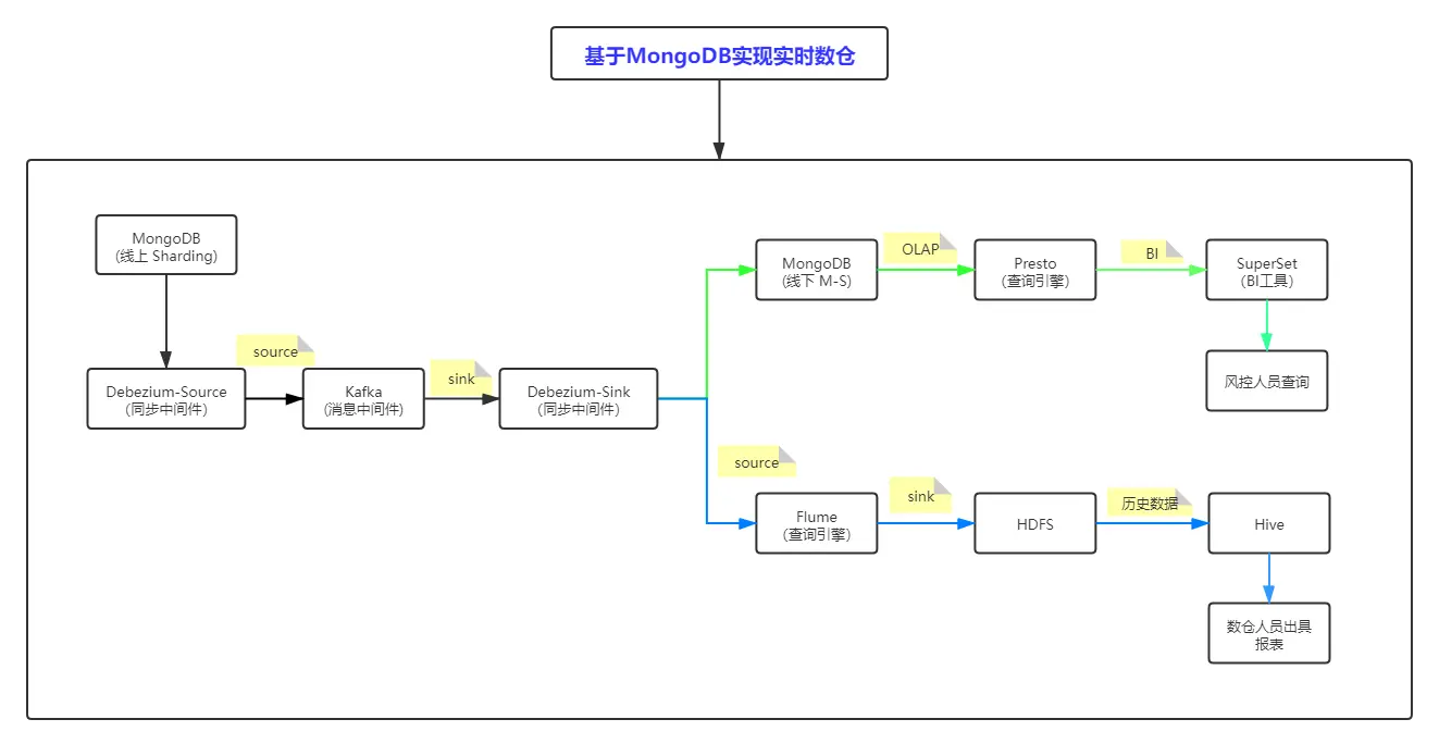 a) 架构图中"绿色"线条是提供风控业务人员实时查询策略效果的流程图,由于服务器资源有限,因此从上线MongoDB-Sharding实时同步到线下MongoDB—RS(副本),因此不可能保存全部数据,而且对保存数据的有效期也有限制,在实现前期规划中实时数据默认保留14天(在线下mongodb库中对数据表需要增加过期索引)