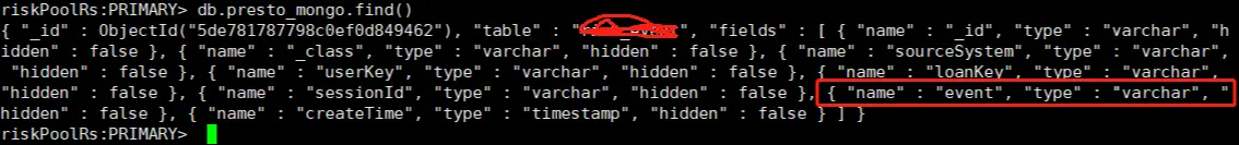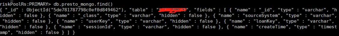 问题:presto 连接mongo读取数据时,发现没有显示所有的字段?? 解决:在mongo库中查询schema数据,发现缺少某些字段值,登陆mongo手动更新schema数据,增加指定域值的显示,定义为varchar类型。 修改之前