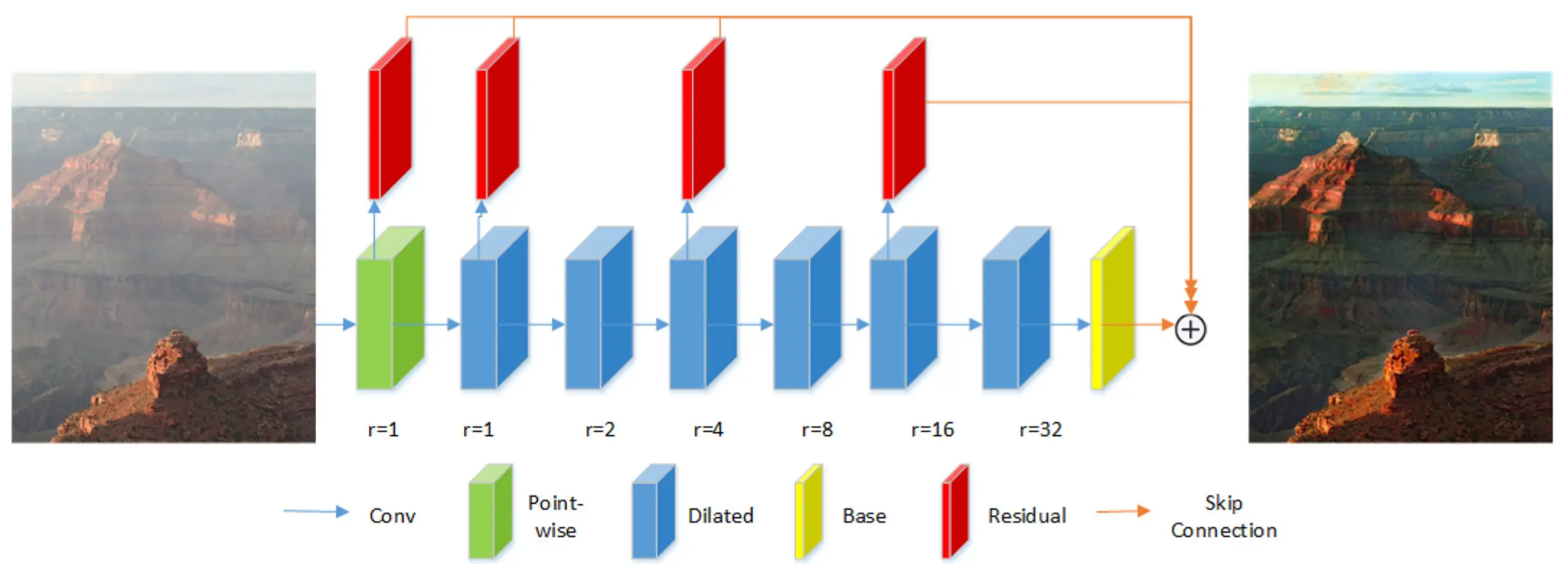 - 物体以不同比例出现。在过去的某些论文里,使用了多尺度卷积的技巧来提高去雾效果。但是文章发现这样的做法并不能很好的去雾,所以想到了引入扩张卷积的方式。