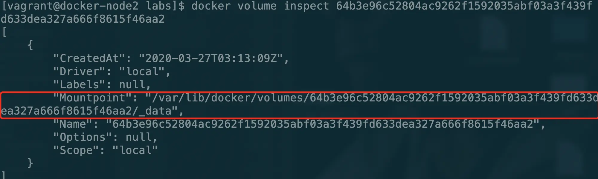 我们也可以使用inspect来查看一下vloume的具体细节(后面记得修改为自己的VOLUME NAME)
