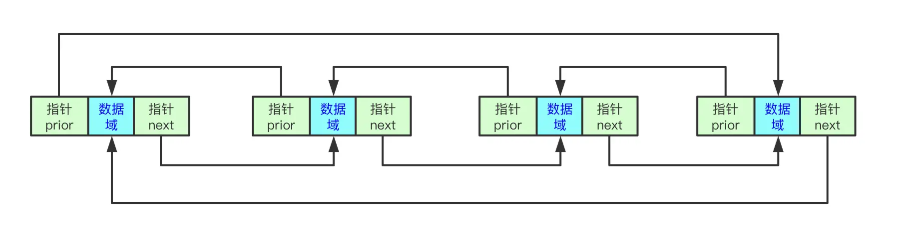 话不多说,双向循环链表,也就是如图所示的一种双向指针的数据结构,从下图中可以看到,双向链表中各节点包含以下 3 部分信息(如下图所示): 指针域 prior:用于指向当前节点的直接前驱节点; 数据域 data:用于存储数据元素。 指针域 next:用于指向当前节点的直接后继节点; 当仅有一个数据的时候,next、prior都是指向本身.