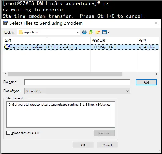 cd /home/software/aspnetcore(2)输入“rz”,回车,在弹窗的文件选择框中选择本地磁盘中需要上传的文件,点击【Add】按钮。