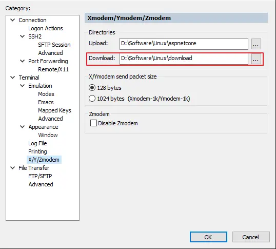 点击【Terminal】下的【X/Y/Zmodem】,修改下载路径,如下图