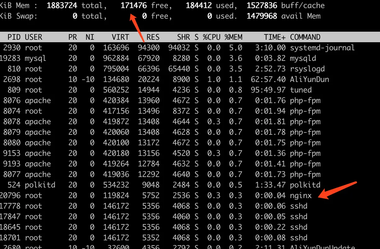 如上图所示:系统也就2g ,除了mysql占用的100M, httpd 占了1/2 还多