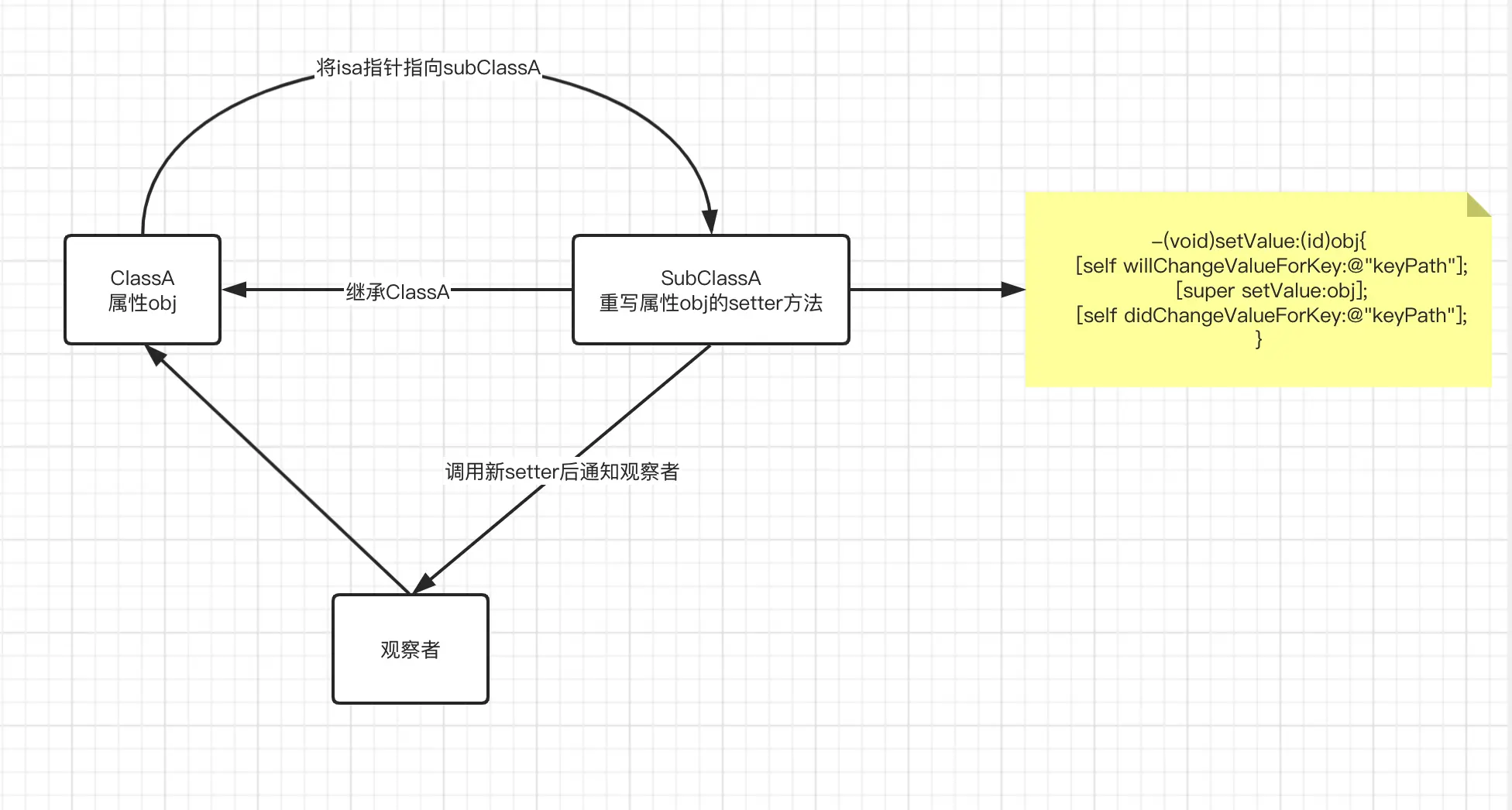 NSKVONotifying_A,然后重写对应属性的setter方法,然后将isa指针指向NSKVONotifying_A。例如: