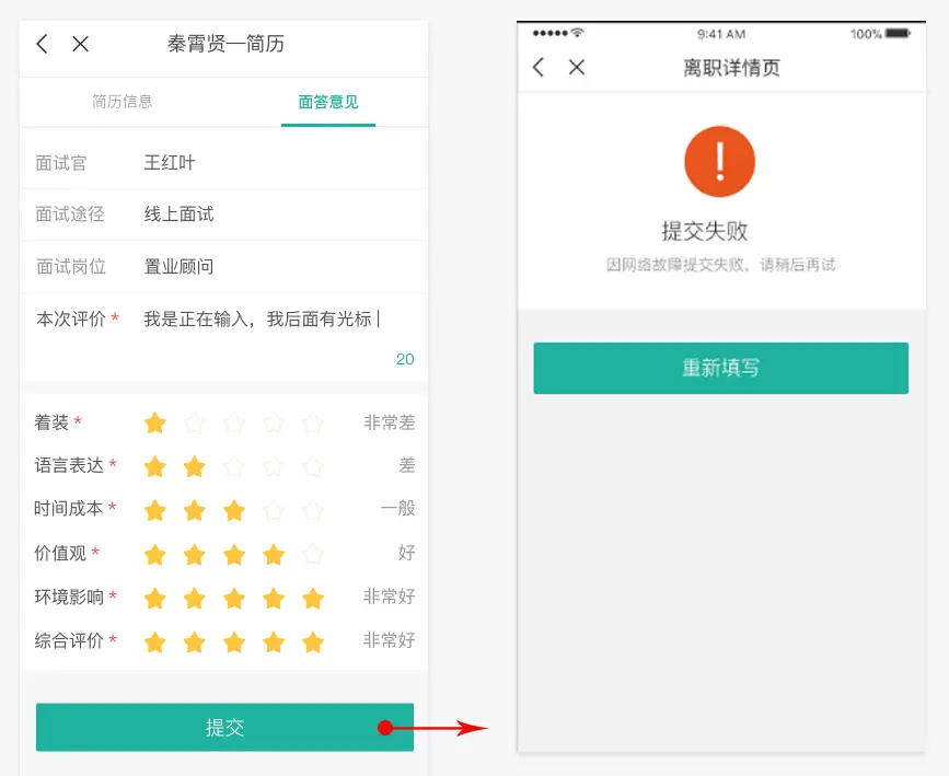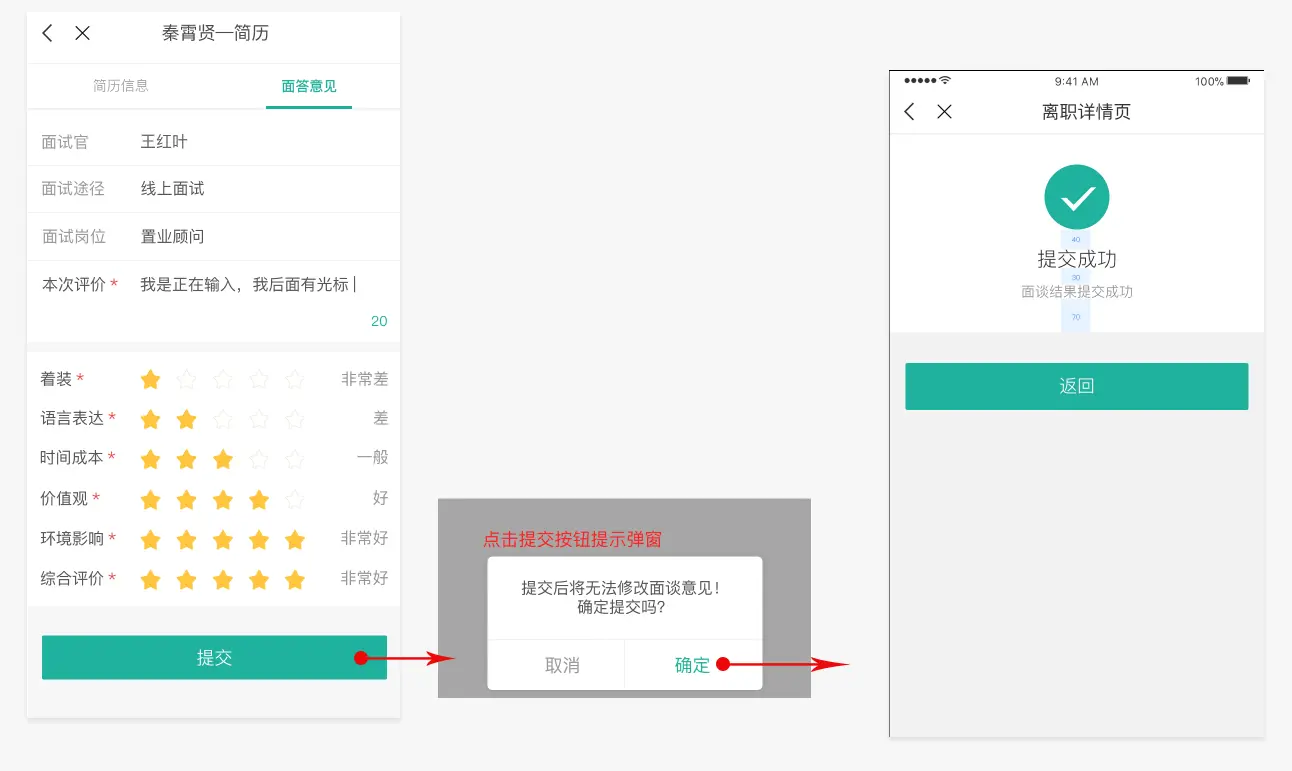 例如近期做的人资项目里的提交面试意见的一个小流程,我就没有做好路径最短化,在逻辑上和情感化设计上看来个二次确认是没有问题的,但在实际操作中,面试官在填完面试评价后连看都不会在看了,怎末会在乎能不能修改,而且面试官每天会面试很多人,每个都需要来个二次确认这样算来操作成本增大了很多,久而久之肯定会让用户怨声载道。还好设计评审时在同事的建议下去掉了二次确认弹框。