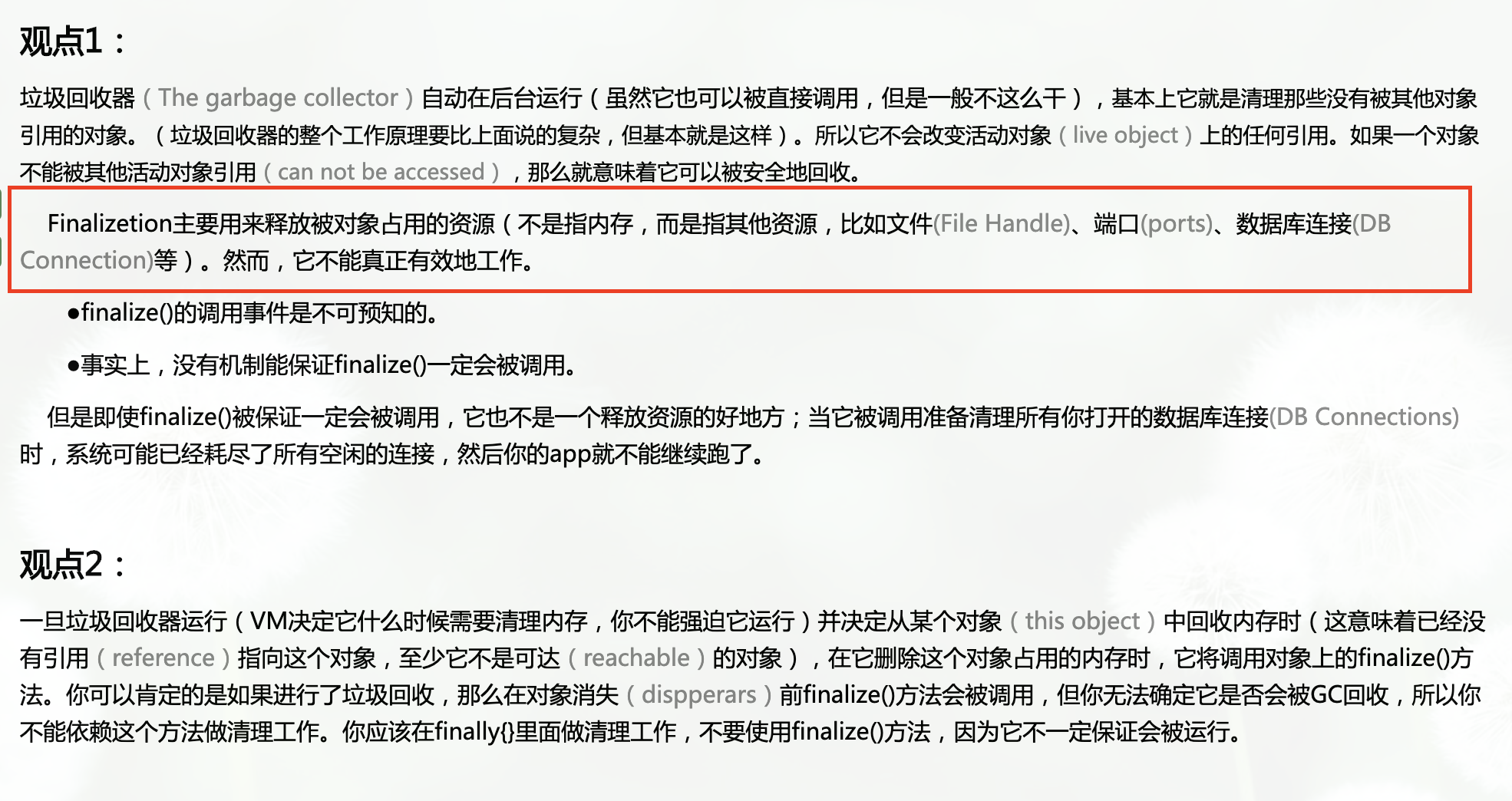 从以上观点总结:GC是用来回收对象占用的内存的,而finalize()这个东西会被finalizer调用,用来回收资源(文件、端口、数据库连接等),但是try-catch 能做的更好。