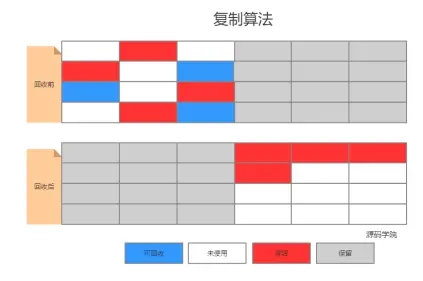 2、为了解决效率问题,“复制”收集算法出现了。它可以将内存分为大小相同的两块,每次使用其中的一块。当这一块的内存使用完后,就将还存活的对象复制到另一块去,然后再把使用的空间一次清理掉。这样就使每次的内存回收都是对内存区间的一半进行回收。