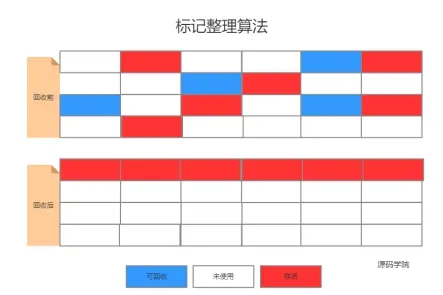 根据老年代的特点提出的一种标记算法,标记过程仍然与“标记-清除”算法一样,但后续步骤不是直接对可回收对象回收,而是让所有存活的对象向一端移动,然后直接清理掉端边界以外的内存。