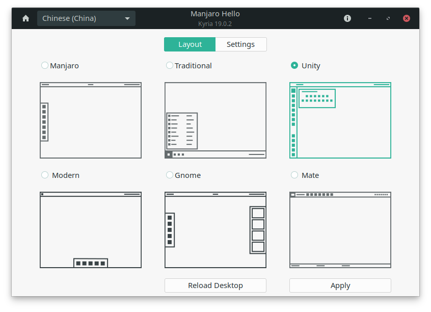 首先是开机的时候就弹出来Hello界面,以前没怎么注意它,这次发现居然已经预设了好几种布局,真的啥都有,连自己折腾都省得了。我果断选了最喜欢的unity布局(其实就是装了unite插件),效果很不错~