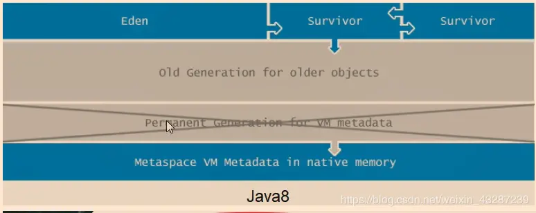 从图中我们可以看出JAVA8的JVM 用元空间取代了永久代