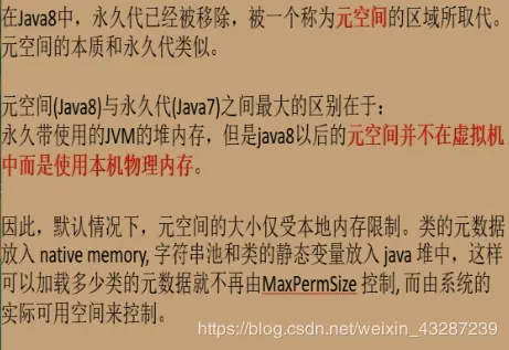 元空间的本质和永久代类似,都是对JVM规范中方法区的实现,不过元空间与永久代之间最大的区别在于:元空间并不在虚拟机中,而是使用本地内存。因此,默认情况下,元空间的大小仅受本地内存限制。