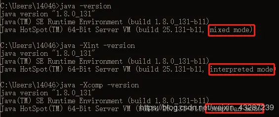 java -Xint -version:解释执行java -Xcomp -version:第一次使用就编译成本地代码java -Xmixed:混合模式