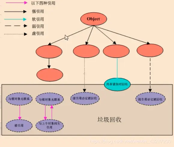 活着,垃圾收集器不会碰这种对象。在Java中最常见的就是强引用,把一个对象赋给一个引用变量,这个引用变量就是一个强引用。当一个对象被强引用变量引用时,它处于可达状态,它是不可能被垃圾回收机制回收的。即使该对象以后永远都不会被用到,JVM也不会回收。 因此强引用是造成Java内存泄漏的主要原因之一。 - 对于一个普通的对象,如果没有其他的引用关系,只要超过了引用的作用域或者显式地将相应(强)引用赋值为null,一般就是认为可以被垃圾收集(具体看垃圾收集策略)