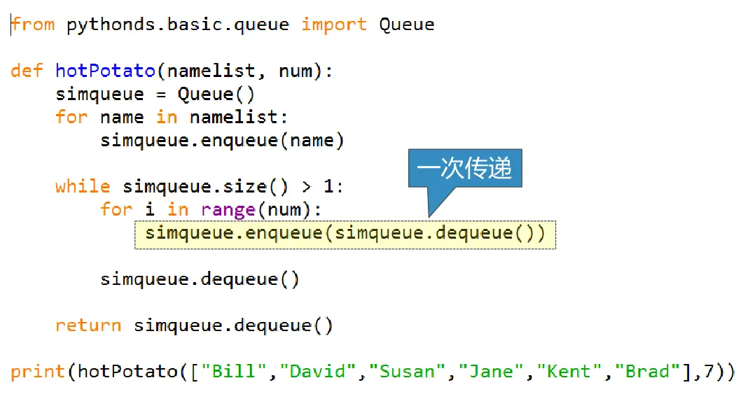 用队列来实现热土豆问题的算法,参加游戏的人名列表,以及传土豆次数num,算法返回最后剩下的人名