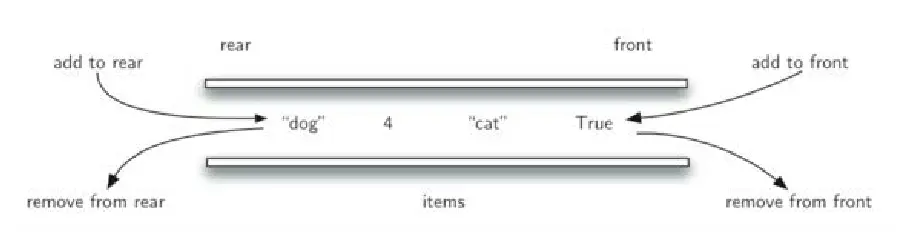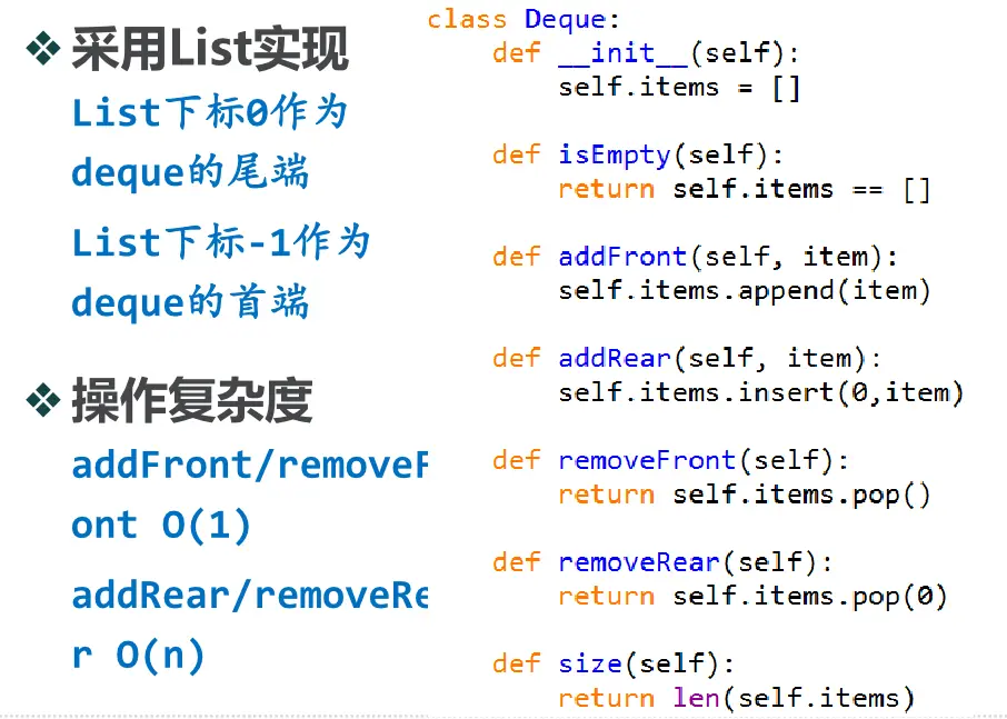 - deque的主要操作包括addFront, addRear, removeFront, removeRear, isEmpty