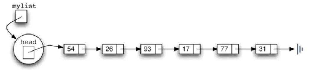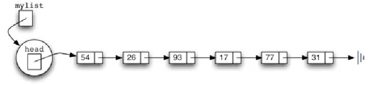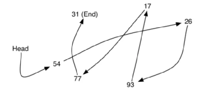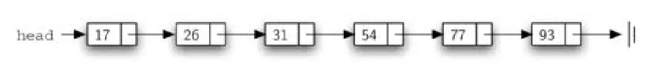 以整数数据项为例,(17, 26, 31, 54, 77,93)的链表形式如图