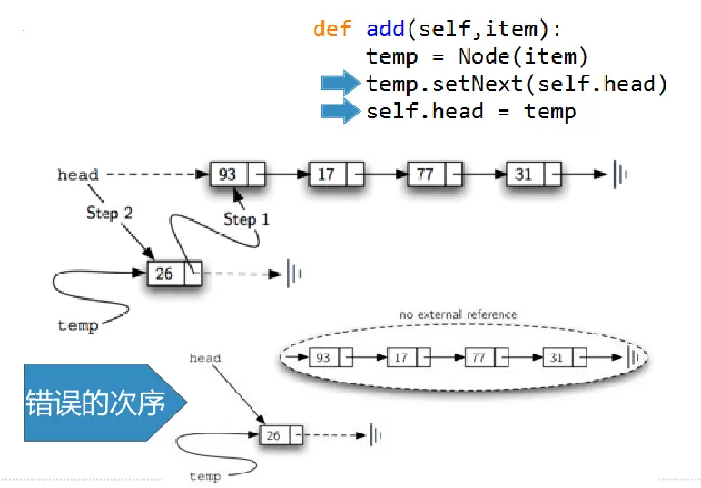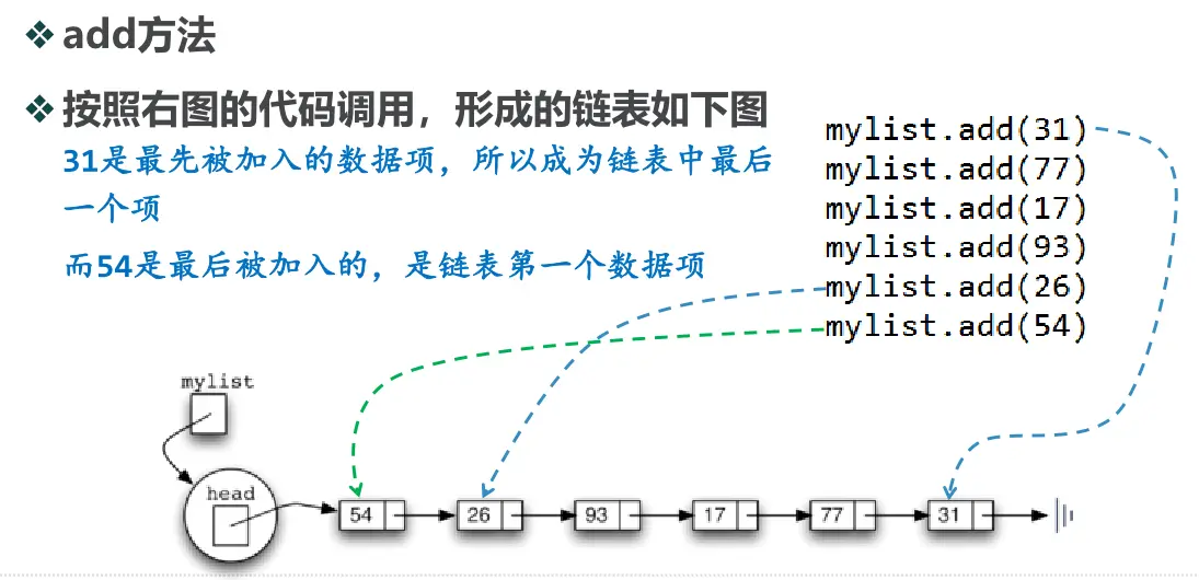 - 无序表的add方法是O(1),因为仅需要插入到表头