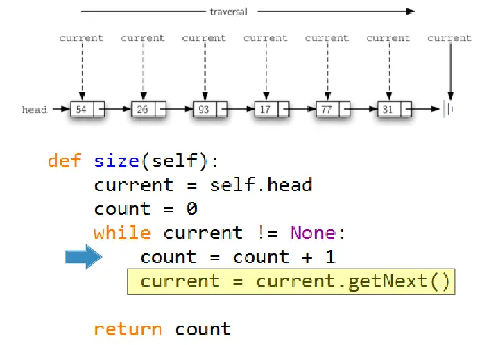 size:从链条头head开始遍历到表尾同时用变量累加经过的节点个数。