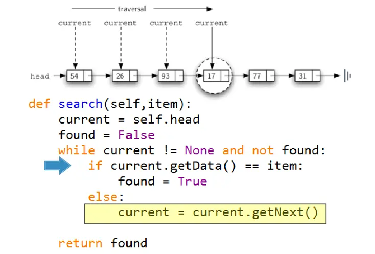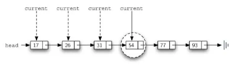 从链表头head开始遍历到表尾,同时判断当前节点的数据项是否目标