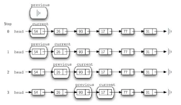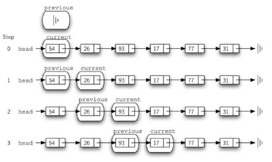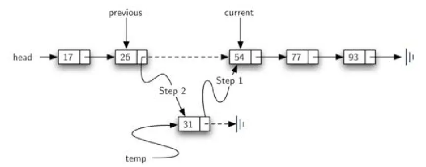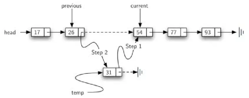 比如在(17, 26, 54, 77, 93)的有序表中,加入数据项31,我们需要沿着链表,找到第一个比 31大的数据项54,将31插入到54的前面