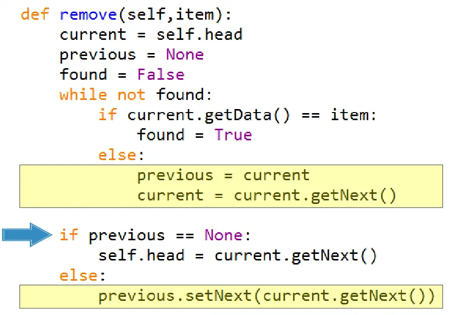 找到item之后,current指向item节点,previous指向前一个节点,开始执行删除,需要区分两种情况: