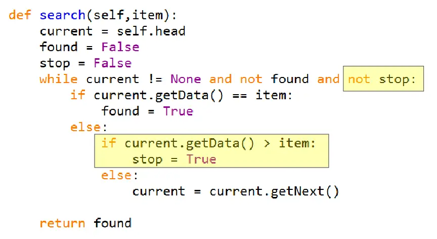 对于有序表来说,可以利用链表节点有序排列的特性,来为search节省不存在数据项的查找时间。一旦当前节点的数据项大于所要查找的数据项,则说明链表后面已经不可能再有要查找的数据项,可以直接返回False