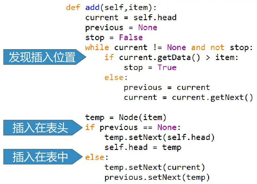 相比无序表,改变最大的方法是add,因为add方法必须保证加入的数据项添加在合适的位置,以维护整个链表的有序性