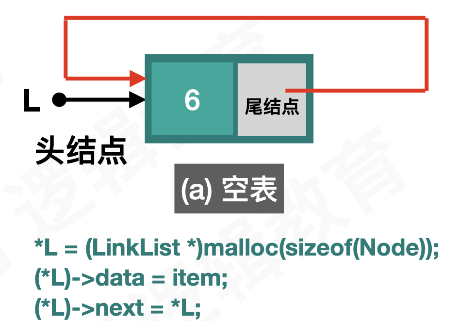 (*L)->next=*L;//使其next指针指向自己 (*head)->next=*head;==>循环