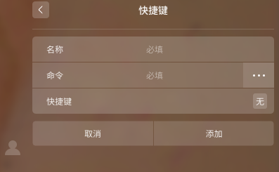 打开之后我们可以看到一个添加自定义快捷键的页面,我们需要填入三项内容:名称,命令,快捷键。