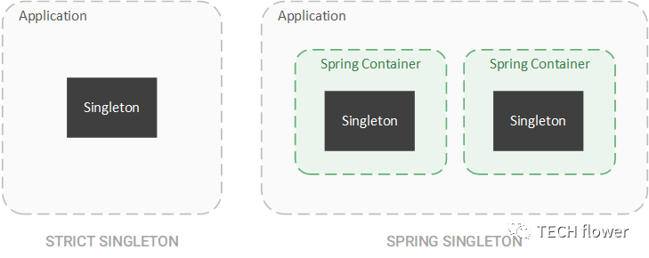 Spring的方法不同于严格的单例定义,因为一个应用程序可以具有多个Spring容器。因此,如果我们有多个容器,则同一类的多个对象可以在单个应用程序中存在。