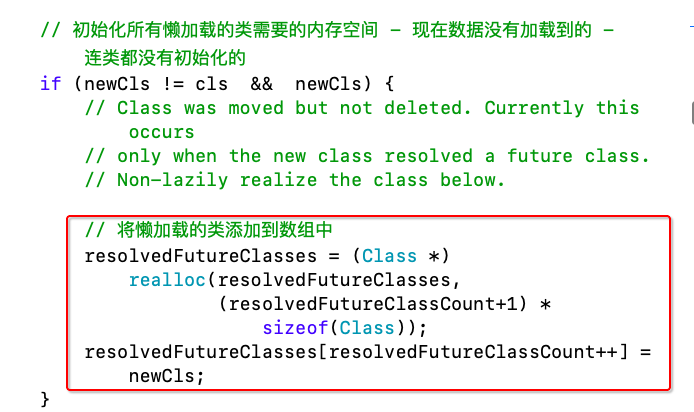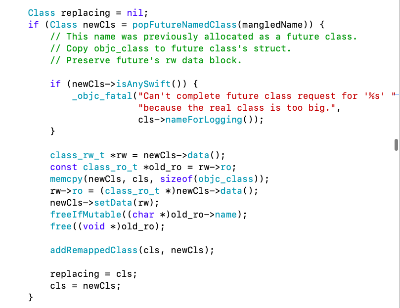 readClass1. 判断是不是后期加载的类,是,则读取class 的 date() 设置 rw 、 ro 2. addNamedClass(cls, mangledName, replacing) 3. addClassTableEntry(cls) 插入到表中 -