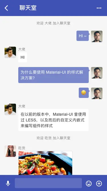 按以上的约定基本可以满足一个简单的聊天室了。另外,如果组件层级比较多,组件粒度拆得比较细的话,在不考虑业务组件复用的情况下,可以引入一些共享状态,如:currentUserId、socket、activeTool 等,可有效避免父子组件状态传达,但这里需要开发者自行权衡复用性。
