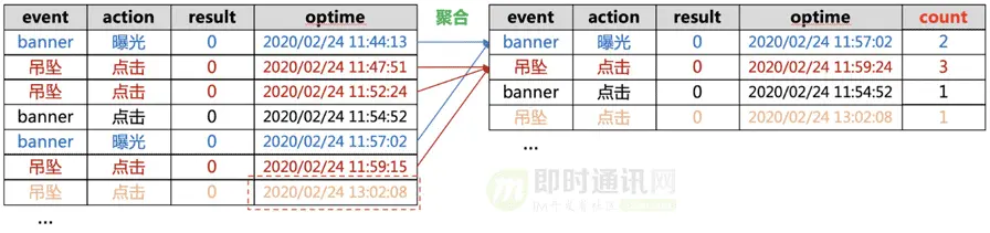 另外,针对特定的需求场景,有些数据可能是不能聚合的。例如,我们对于操作时间超过1小时的相同数据是不会进行聚合处理的,因为今年春节活动有场次的概念,每场活动间隔1个小时,产品同学可能需要以场次维度统计相关数据,若合并可能会干扰数据统计的准确性。