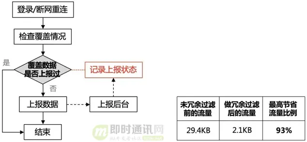 2)确保关键指标数据上报成功,并过滤冗余数据:把覆盖类指标每日一检的方式改为每次登录/断网重连时就触发覆盖检查,并加上一定的频控,覆盖检查得出结果后即上报。当覆盖数据实际触发上报到后台并成功回包后,本地记录上报的状态,这样当下次触发覆盖检查上报前,若判断该覆盖数据已上报过,就不再上报,直接作为冗余数据过滤掉。相比每日一检的方式(每天都会产生多条覆盖数据上报),这种方式单用户最多可以节省93%的覆盖数据量。