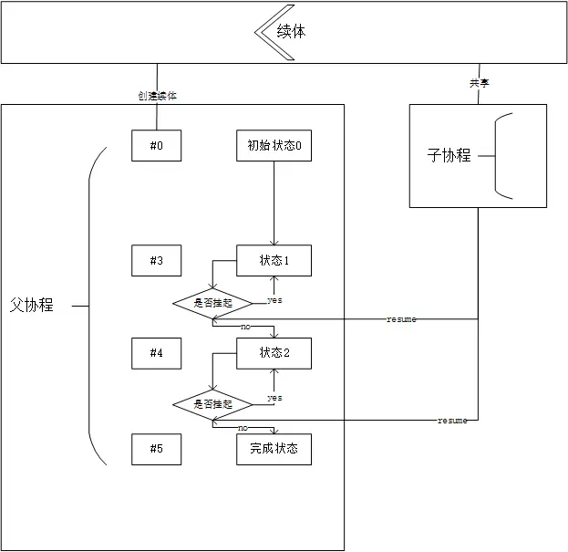 一段协程体对应一个续体,一个续体对应多个挂起函数。当执行某个挂起函数时,在挂起函数内部能够拿到这样一个称为续体的对象,这个对象和状态机结合,调用resumeWith去恢复每一个挂起点,可简单理解调用notifyAll函数
