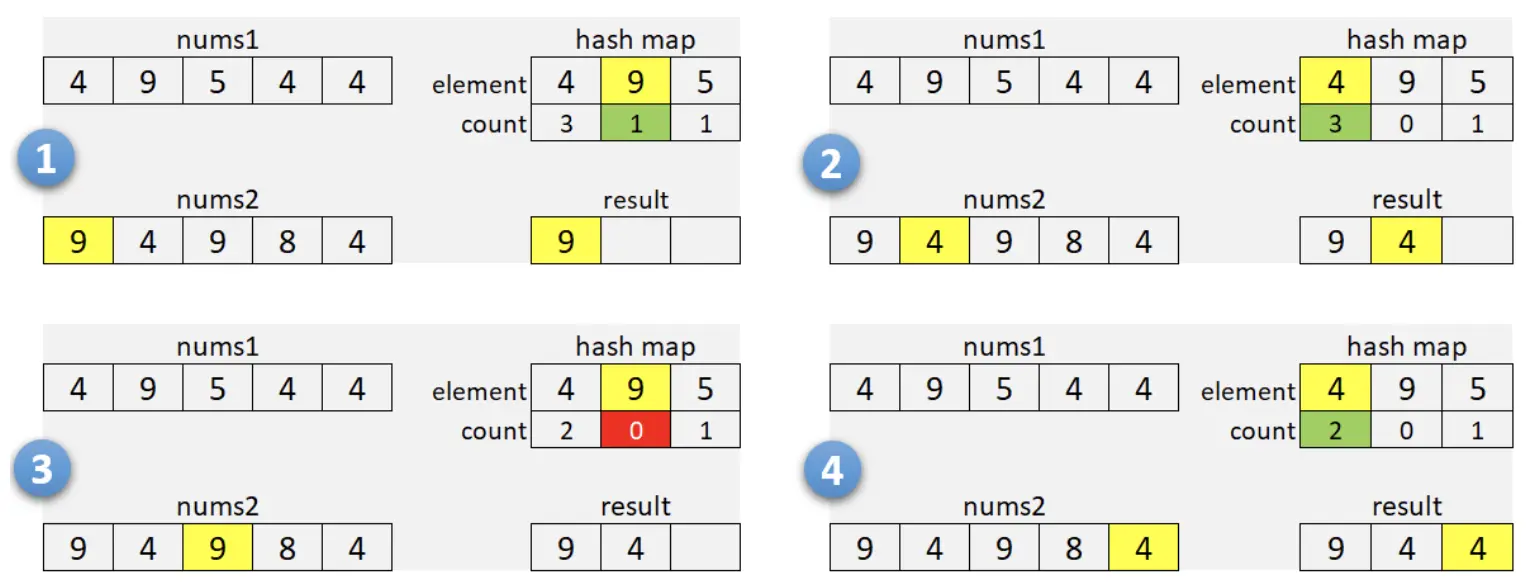 - 对于 nums1 的每个元素,添加到 HashMap m 中,如果元素已经存在则增加对应的计数。