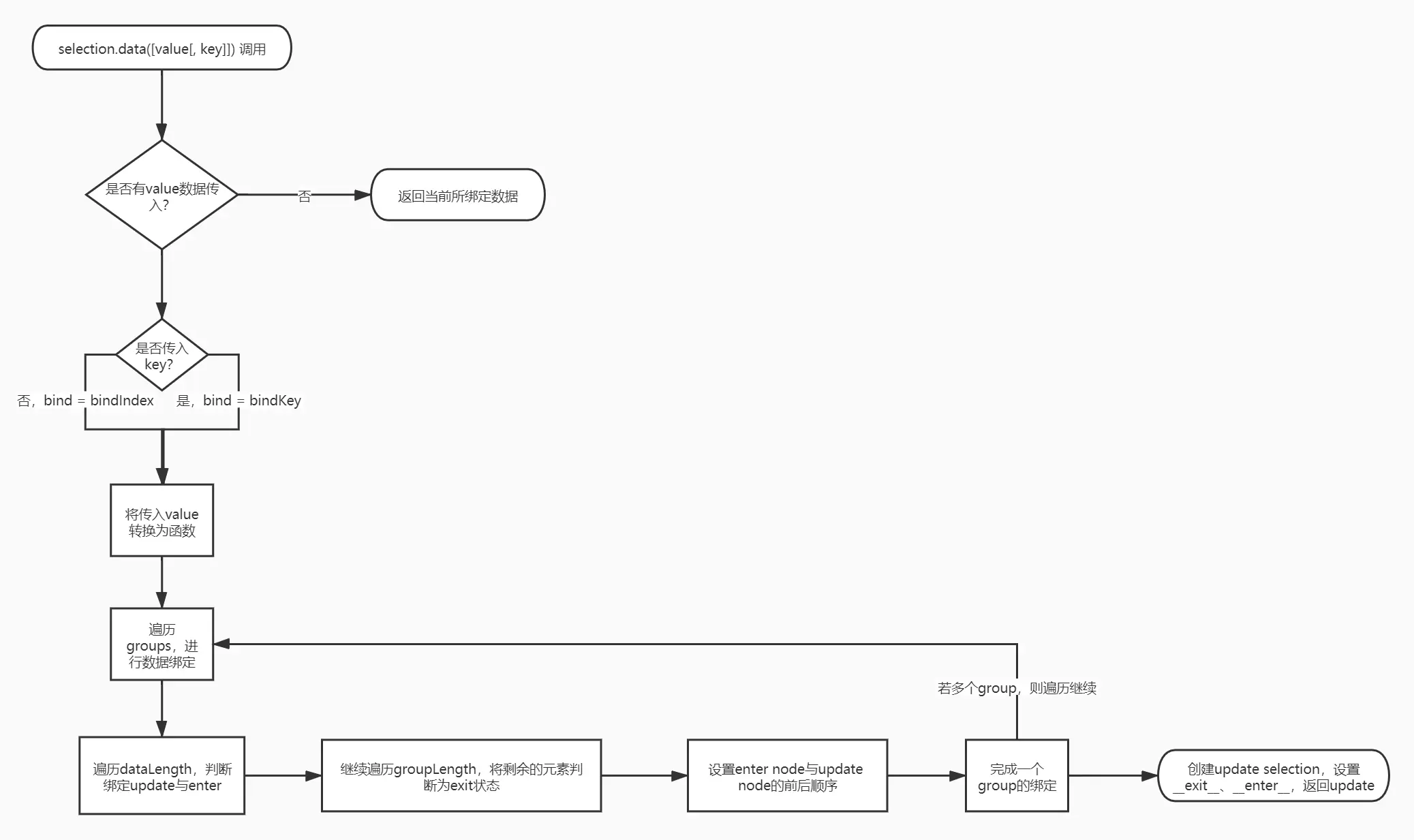 bind(parent, group, enterGroup, updateGroup, exitGroup, data, key);//根据先前判断的绑定函数进行绑定