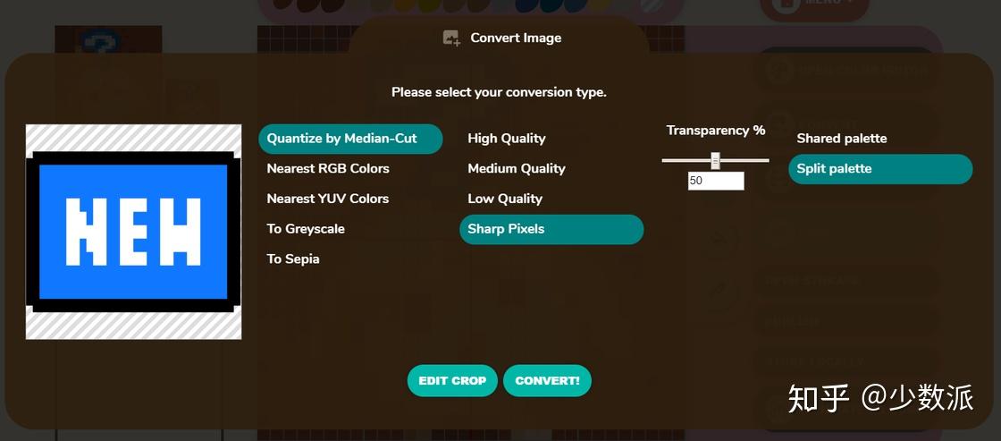 不仅如此,它还能把帮你把一张照片转换成像素画。使用起来也非常简单,点击「Convert Image」,选择一张本地的照片上传,然后再根据自己的需要调整颜色、精细度和透明度,点击「Convert」就转换完成了。