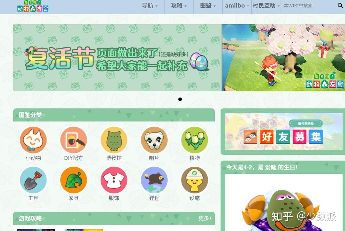 这个站点由非官方岛民代表组织「动森搬砖部」建设制作,虽然 3 月份才刚刚建站,但资料的更新速度比较快,鱼类、昆虫和 DIY 配方的信息收集比较全面,像最新的复活节活动相关内容也有涵盖。
